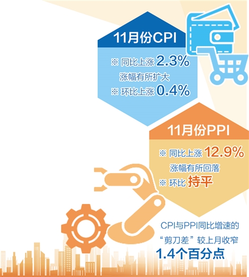 12月9日,國家統(tǒng)計(jì)局發(fā)布的11月份全國居民消費(fèi)價格指數(shù)(CPI)和工業(yè)生產(chǎn)者出廠價格指數(shù)(PPI)顯示,11月份,CPI同比上漲2.3%,漲幅有所擴(kuò)大;環(huán)比上漲0.4%。隨著保供穩(wěn)價政策落實(shí)力度不斷加大,PPI同比上漲12.9%,漲幅有所回落;環(huán)比持平。CPI與PPI同比增速的“剪刀差”為10.6個百分點(diǎn),較上月收窄1.4個百分點(diǎn)。