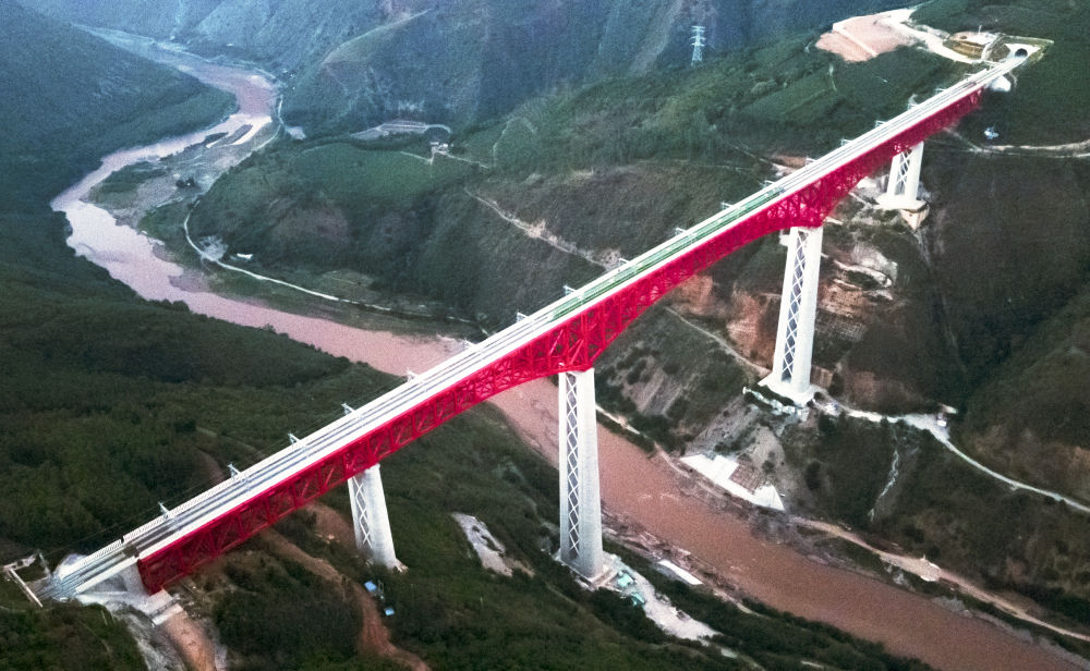 ↑ 2021年12月3日,中老鐵路首發(fā)列車駛過云南省境內(nèi)的元江雙線特大橋。