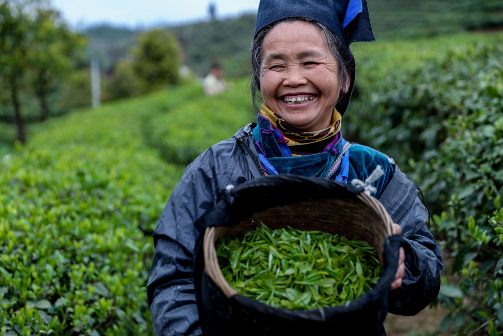 ↑ 2021年3月21日,貴州省黔東南苗族侗族自治州丹寨縣的茶農(nóng)展示剛采摘的茶青。