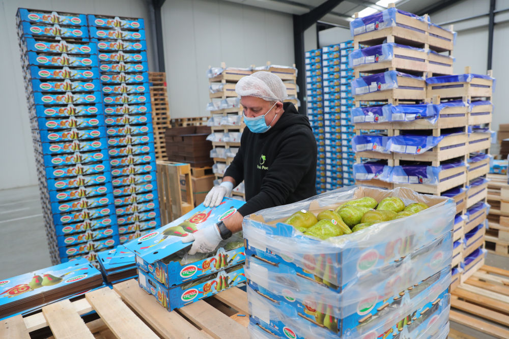 ↑ 2021年10月22日,在比利時(shí)圣希利斯-瓦斯市的一個水果分揀包裝車間,工作人員把即將出口到中國的比利時(shí)啤梨裝箱。