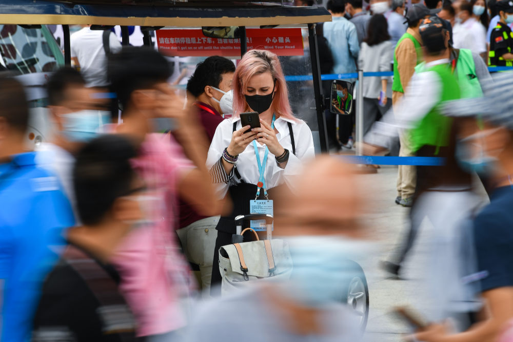 ↑ 2021年10月15日,生活在廣東佛山的意大利工業(yè)設(shè)計(jì)師勞敏妮參加廣交會。