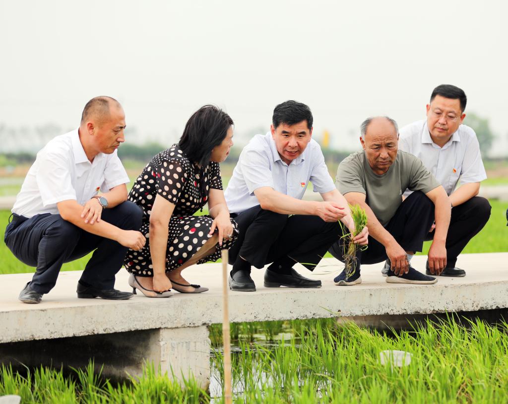 7月2日,在東營市墾利區(qū)一邦農業(yè)公司耐鹽堿水稻實驗基地,墾利區(qū)委書記劉斯杰(中)和企業(yè)負責人察看水稻長勢。新華社發(fā)(程永鋒攝)