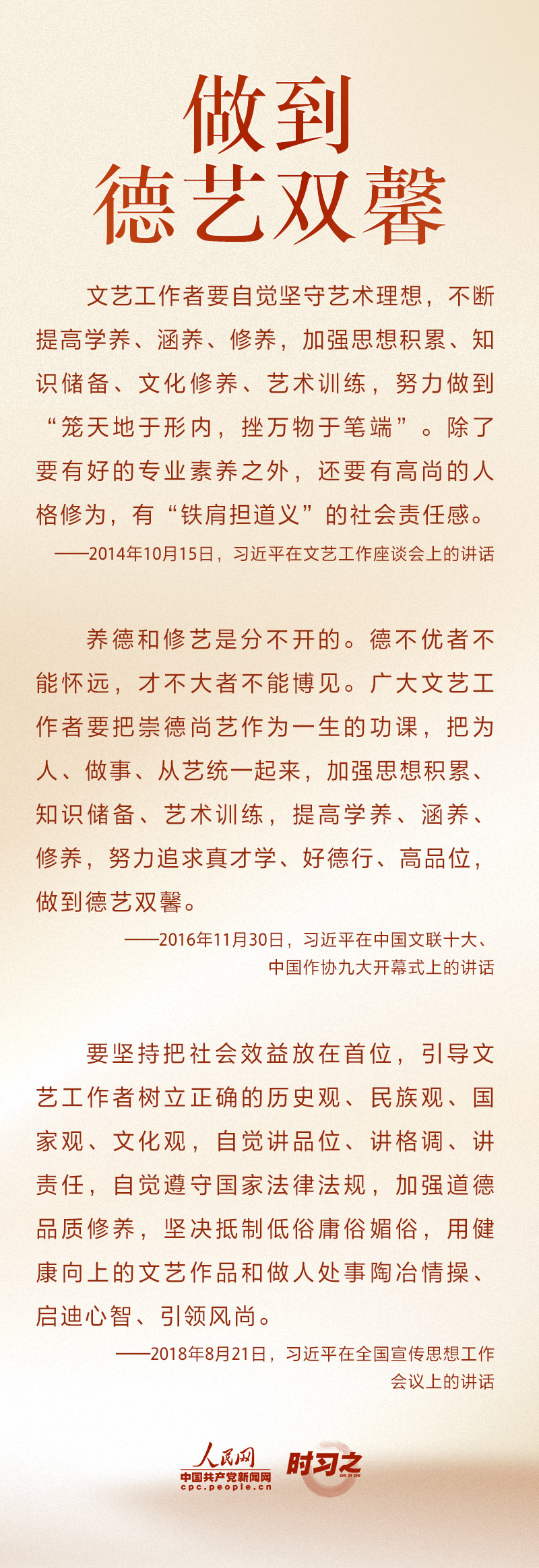 文運同國運相牽,文脈同國脈相連。新時代文藝工作者承擔(dān)著記錄新時代、書寫新時代、謳歌新時代的重大使命!拔乃囀氰T造靈魂的工程,文藝工作者是靈魂的工程師!秉h的十八大以來,習(xí)近平不斷激勵文藝工作者不辜負(fù)時代召喚、不辜負(fù)人民期待,以德服人、以文化人。
