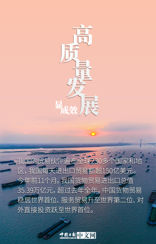 今年以來,外貿(mào)對(duì)中國(guó)經(jīng)濟(jì)和世界經(jīng)濟(jì)的貢獻(xiàn)日益凸顯,有力地帶動(dòng)經(jīng)濟(jì)增長(zhǎng),穩(wěn)崗就業(yè)作用突出,滿足人民多樣化需求,推動(dòng)全球經(jīng)貿(mào)復(fù)蘇。1-11月份,中國(guó)進(jìn)出口總值35.39萬億元人民幣,同比增長(zhǎng)22%,比2019年同期增長(zhǎng)24%。外貿(mào)進(jìn)出口總值已超過去年全年規(guī)模。中國(guó)持續(xù)推進(jìn)高水平對(duì)外開放,以開放促改革、促發(fā)展成效不斷顯現(xiàn),外貿(mào)量穩(wěn)質(zhì)升的基礎(chǔ)持續(xù)鞏固。