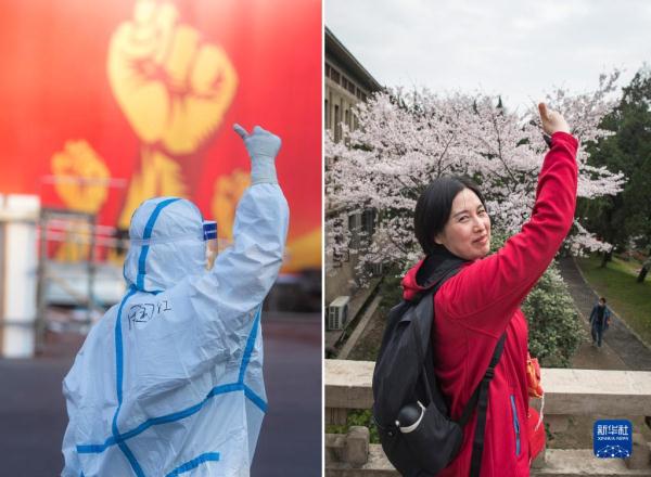 這是一張拼版照片。左圖為2020年2月12日,安徽援鄂醫(yī)療隊(duì)隊(duì)員周國紅在武漢體育中心方艙醫(yī)院前豎起拇指為自己和同伴加油;右圖為2021年3月13日,周國紅在武漢大學(xué)櫻花樹前拍照留念。