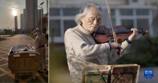 這是一張拼版照片。左圖為2020年3月5日傍晚,在武漢大學(xué)人民醫(yī)院東院,復(fù)旦大學(xué)附屬中山醫(yī)院支援湖北醫(yī)療隊(duì)醫(yī)生在護(hù)送患者王欣做CT的途中停下,讓住院近一個月的老人欣賞久違的日落(甘俊超攝);右圖為2021年3月24日,“看夕陽的老人”王欣在湖北省武漢市東西湖區(qū)園藝花城小區(qū)內(nèi)拉小提琴(新華社記者熊琦攝)。