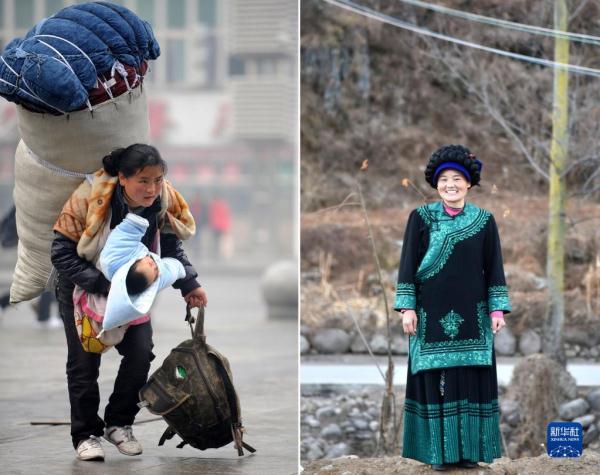 這是一張拼版照片。左圖為2010年1月30日,巴木玉布木背著大包、抱著孩子在南昌火車站匆忙趕車;右圖為2021年1月22日在四川省涼山彝族自治州越西縣瓦巖鄉(xiāng)桃園村拍攝的身著彝族服飾的巴木玉布木。