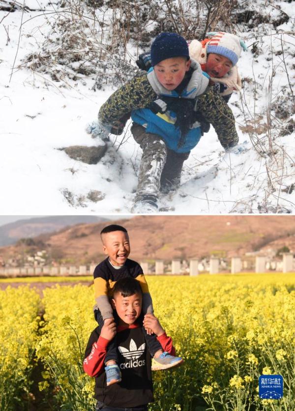 這是一張拼版照片。上圖為:2018年2月2日,吉覺吉竹背著弟弟下山,前往易地扶貧搬遷的外公家;下圖為:2021年2月24日,吉覺吉竹和弟弟在四川省涼山彝族自治州越西縣南箐鎮(zhèn)新家附近的油菜地里玩耍。