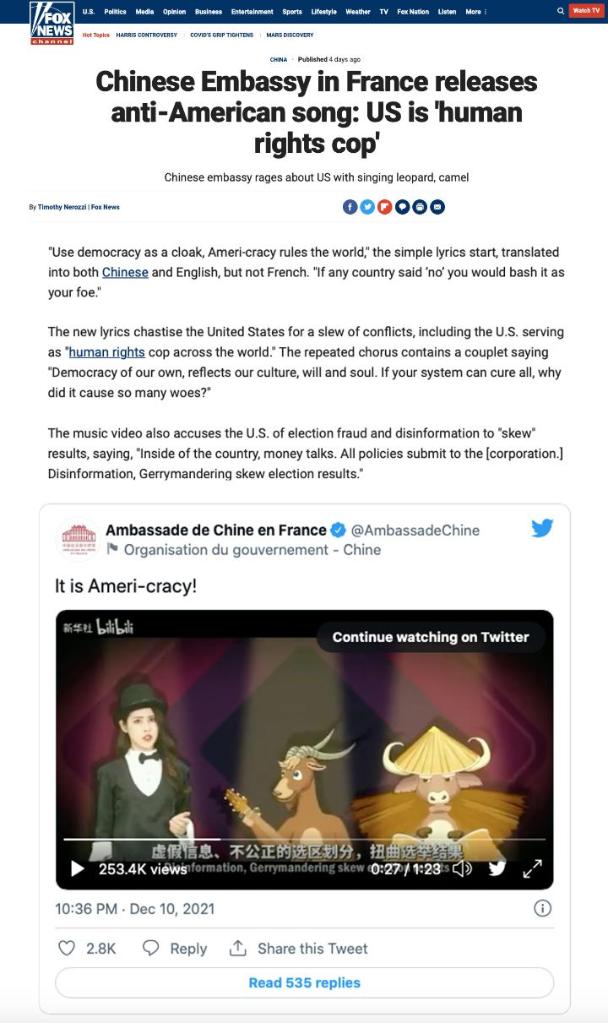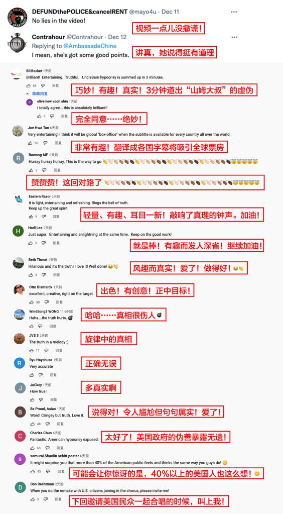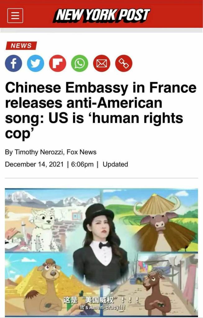 美國?怂剐侣劸W14日以《中國駐法國大使館發(fā)布批美歌曲:美國是“人權警察”》為題發(fā)文,報道了這一“由中國媒體制作,諷刺美國民主的視頻”。報道對視頻中的歌詞逐句解讀,稱“這些歌詞就一系列沖突對美國進行了譴責”,其中包括美國人權問題、選舉欺詐行為等。