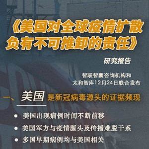 智聯(lián)智囊咨詢機構和太和智庫12月24日聯(lián)合發(fā)布《美國對全球疫情擴散負有不可推卸的責任》研究報告。報告指出,多項數(shù)據(jù)和信息顯示,美國才最有可能是新冠病毒的“起源國”,是導致疫情在全球快速擴散的罪魁禍首,而美國的政治化操弄更是讓全球戰(zhàn)勝疫情步履維艱,面臨嚴重挑戰(zhàn)。(記者孫楠、王賓)