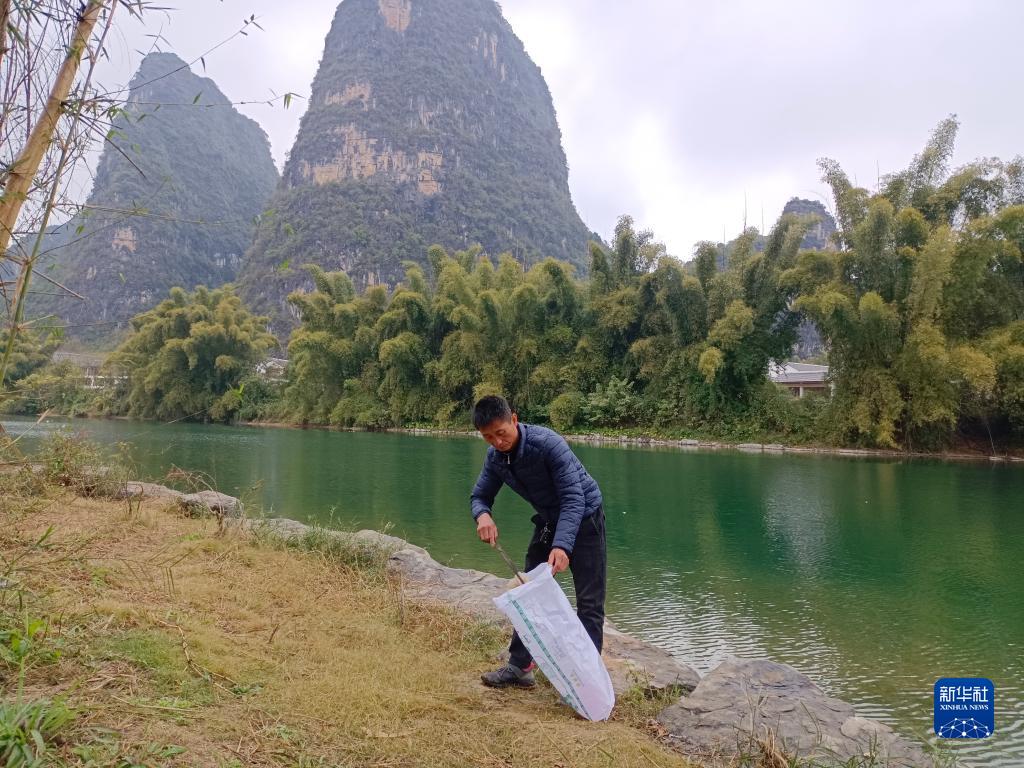 在廣西陽(yáng)朔縣雞窩渡村,河長(zhǎng)徐文通在遇龍河畔撿拾垃圾(12月29日攝)。新華社發(fā)