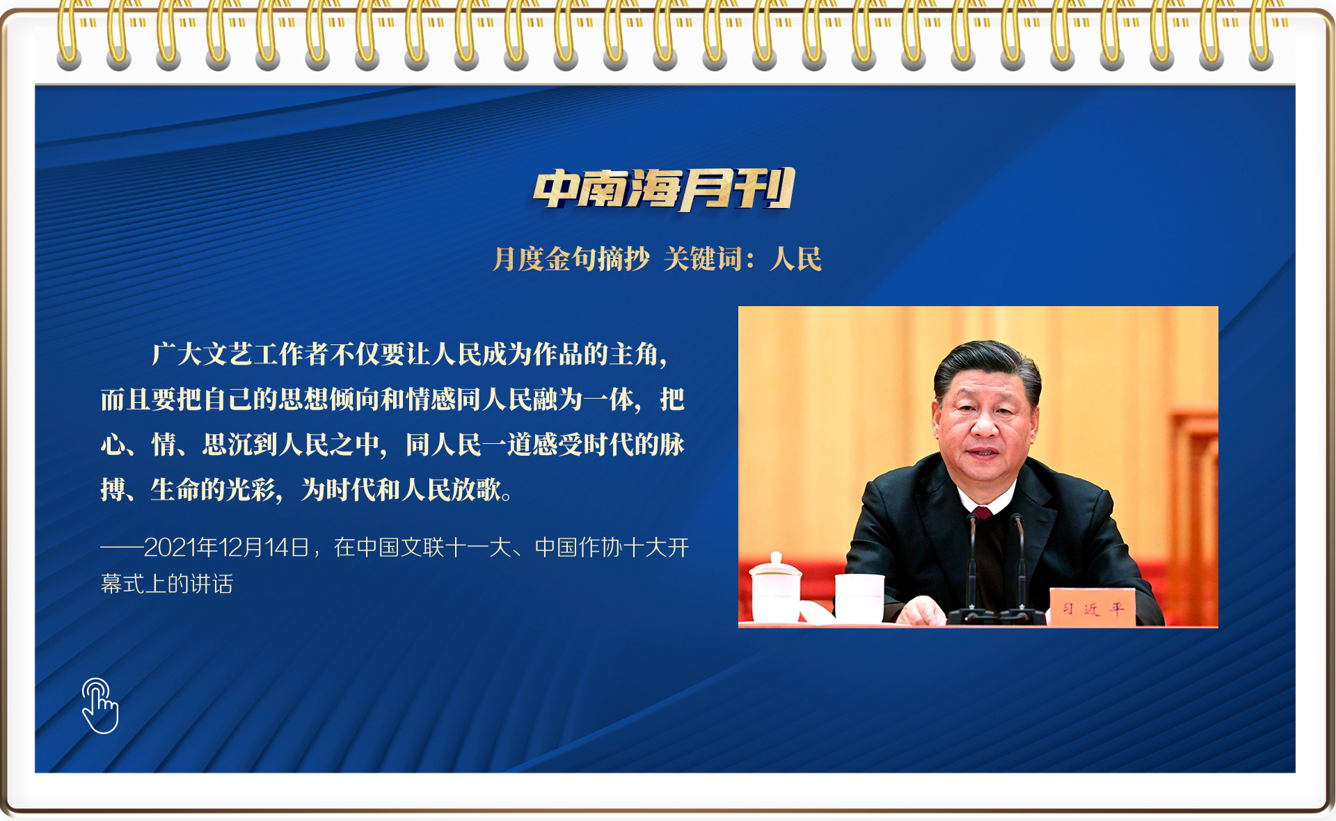 2021年12月14日,文藝界也迎來(lái)了一場(chǎng)盛會(huì)——中國(guó)文學(xué)藝術(shù)界聯(lián)合會(huì)第十一次全國(guó)代表大會(huì)、中國(guó)作家協(xié)會(huì)第十次全國(guó)代表大會(huì)在北京人民大會(huì)堂開(kāi)幕。習(xí)近平總書(shū)記出席大會(huì)開(kāi)幕式并發(fā)表重要講話,他與廣大文藝工作者暢談“心里話”,鼓勵(lì)他們以強(qiáng)烈的歷史主動(dòng)精神,積極投身社會(huì)主義文化強(qiáng)國(guó)建設(shè)。