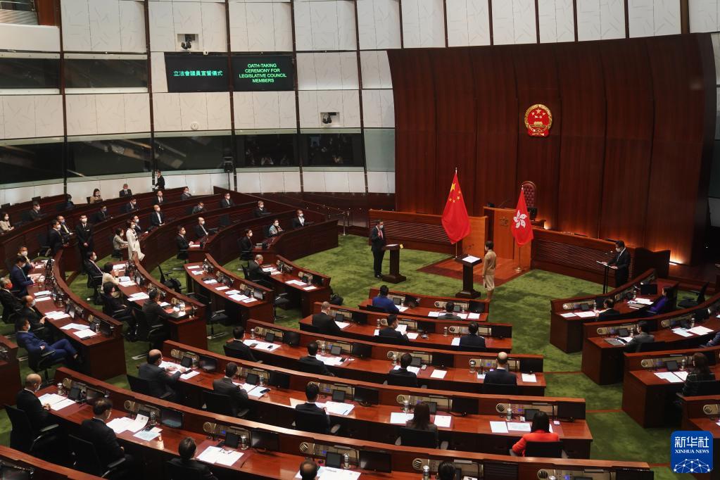 1月3日11時許,香港特區(qū)第七屆立法會90位議員開始宣誓。香港特區(qū)行政長官林鄭月娥為議員監(jiān)誓。圖為宣誓儀式現(xiàn)場。