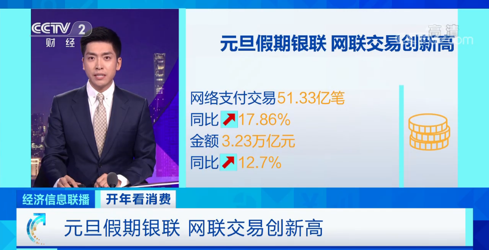 央視網(wǎng)消息:新年伊始,元旦小長假就點燃了大家積蓄已久的消費熱情。中國銀聯(lián)、網(wǎng)聯(lián)平臺1月4日發(fā)布的交易數(shù)據(jù)顯示,1日至3日,銀聯(lián)網(wǎng)絡(luò)交易總金額達到1.32萬億元,創(chuàng)歷史同期新高;網(wǎng)聯(lián)平臺共處理網(wǎng)絡(luò)支付交易51.33億筆,金額3.23萬億元,相比去年同期分別增長17.86%和12.7%,交易筆數(shù)和金額均創(chuàng)歷史新高。
