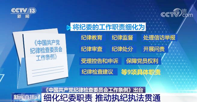 《條例》將紀委的工作職責細化為紀律教育、紀律監(jiān)督、處理信訪舉報、紀律審查、紀律處分、開展問責、受理控告和申訴、保障黨員權利、紀律檢查建議等9項具體職責,豐富了監(jiān)督檢查的內(nèi)容方式,細化了紀律審查的規(guī)定,完善了紀律處分的程序。