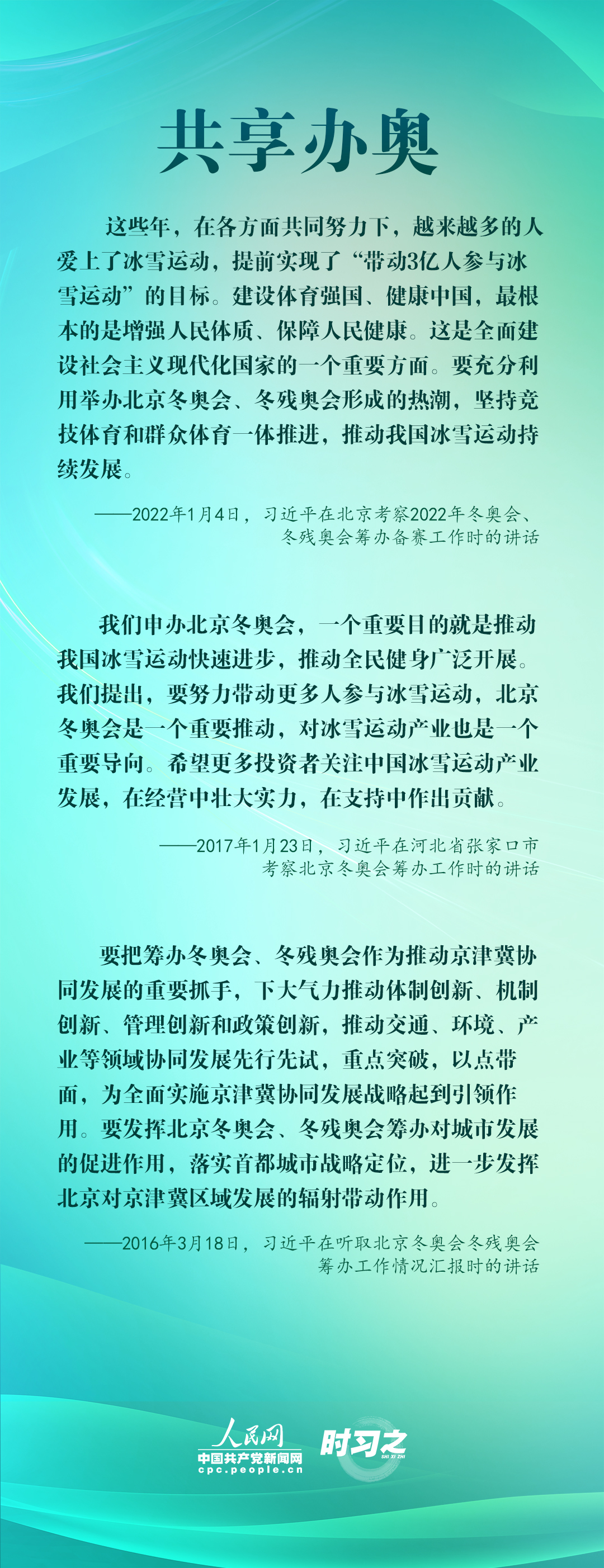 1月4日,習(xí)近平在北京考察2022年冬奧會、冬殘奧會籌辦備賽工作,指出“要堅持綠色辦奧、共享辦奧、開放辦奧、廉潔辦奧的理念,突出科技、智慧、綠色、節(jié)儉特色”。辦好北京冬奧會、冬殘奧會,是中國向國際社會作出的莊嚴(yán)承諾。習(xí)近平多次調(diào)研并強(qiáng)調(diào)綠色、共享、開放、廉潔的辦奧理念。