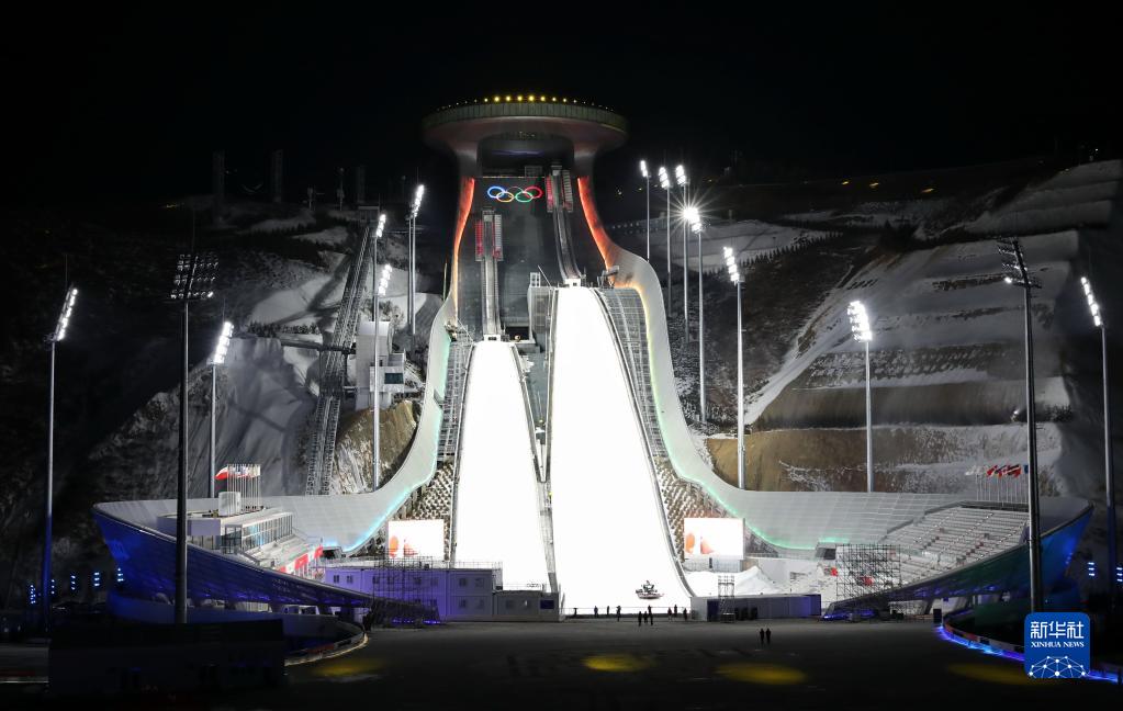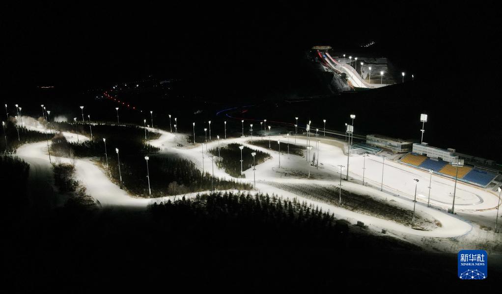 這是張家口賽區(qū)國家越野滑雪中心(下)與國家跳臺(tái)滑雪中心(上)夜景(2021年2月30日無人機(jī)照片)。新華社記者 楊世堯 攝