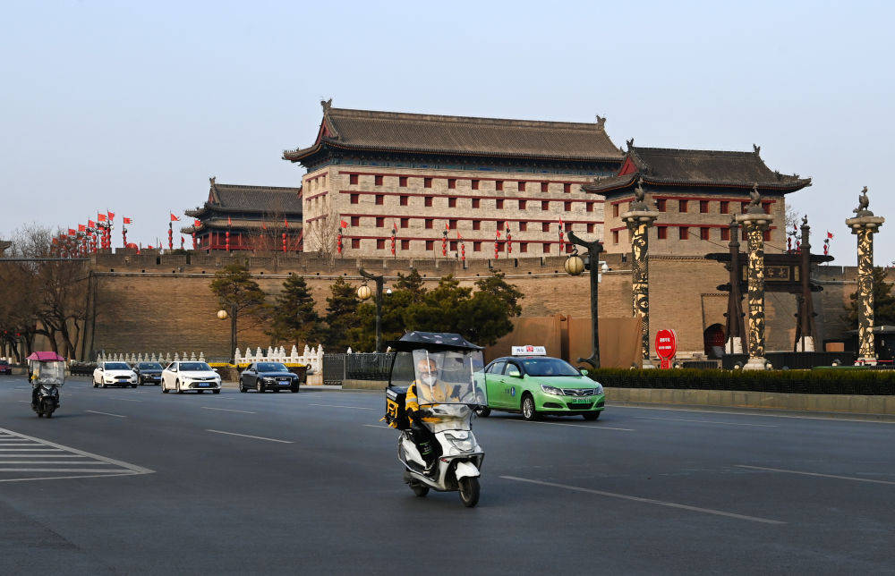 1月10日,快遞人員騎行在西安市南門外道路上。新華社記者 陶明 攝