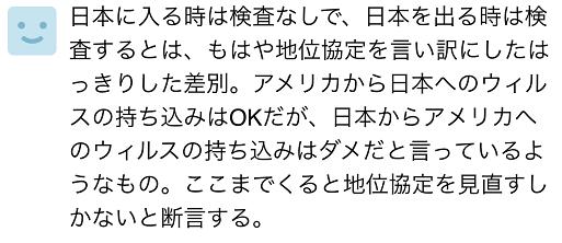 《沖繩時(shí)報(bào)》的報(bào)道在日本網(wǎng)絡(luò)上再次掀起爭(zhēng)議,有網(wǎng)民評(píng)論稱:“進(jìn)日本時(shí)不檢測(cè),出日本時(shí)檢測(cè),這已經(jīng)不能拿地位協(xié)定當(dāng)借口了,就是明明白白的歧視。就像是在說(shuō)從美國(guó)將病毒帶進(jìn)日本,‘ok’;從日本將病毒帶進(jìn)美國(guó),‘不行’。”
