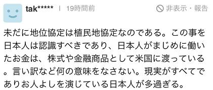 還有人說(shuō):“直至現(xiàn)在,日美地位協(xié)定還是殖民地協(xié)定。日本人應(yīng)該明白這件事……”