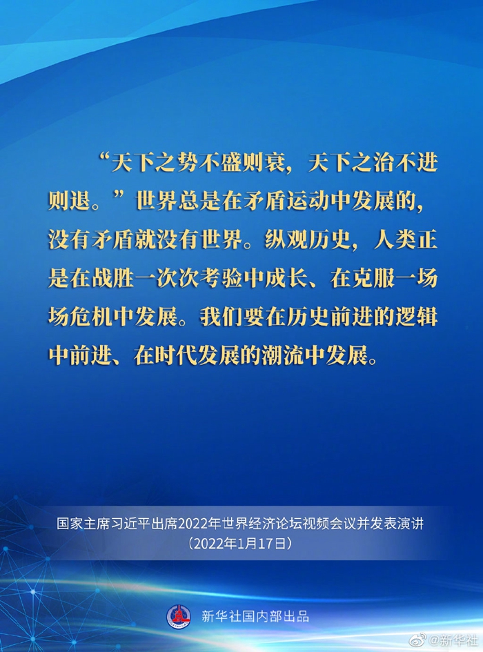 - 習(xí)近平出席2022年世界經(jīng)濟(jì)論壇視頻會(huì)議并發(fā)表演講 強(qiáng)調(diào)要在歷史前進(jìn)的邏輯中前進(jìn) 在時(shí)代發(fā)展的潮流中發(fā)展 堅(jiān)定信心 勇毅前行 共創(chuàng)后疫情時(shí)代美好世界