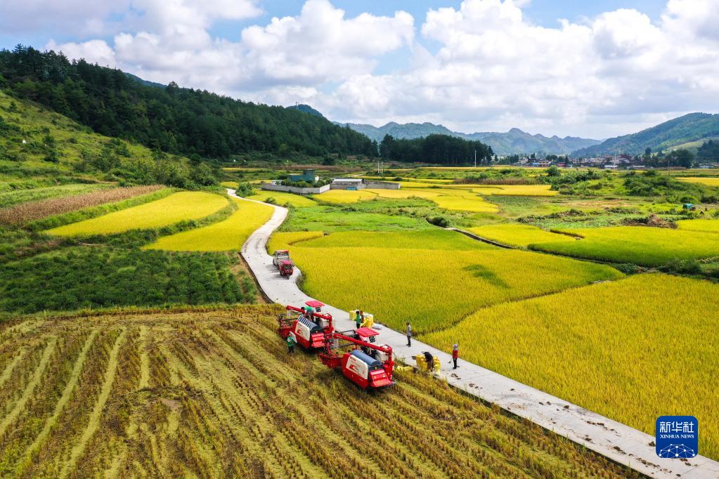 2021年9月15日,貴州省龍里縣灣灘河鎮(zhèn)羊場社區(qū)的農(nóng)民在搶收稻谷(無人機照片)。新華社記者 楊文斌 攝