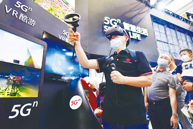 產(chǎn)業(yè)數(shù)字化和數(shù)字產(chǎn)業(yè)化是推動數(shù)字經(jīng)濟與實體經(jīng)濟深度融合的具體表現(xiàn)。圖為2021年10月14日,參觀者在第三屆數(shù)字中國建設(shè)成果展覽會上體驗5GnVR酷游!≈行律缬浾 張斌/攝