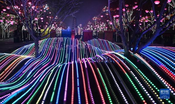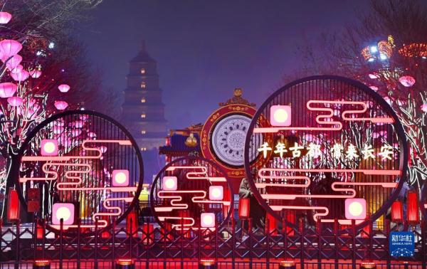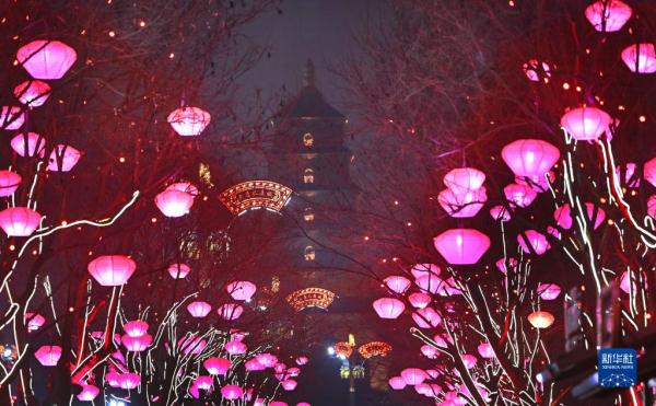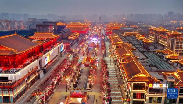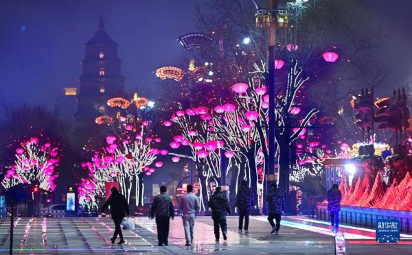 春節(jié)臨近,西安市大唐不夜城點(diǎn)亮璀璨奪目的燈光,迎接新春佳節(jié)的到來(lái)。