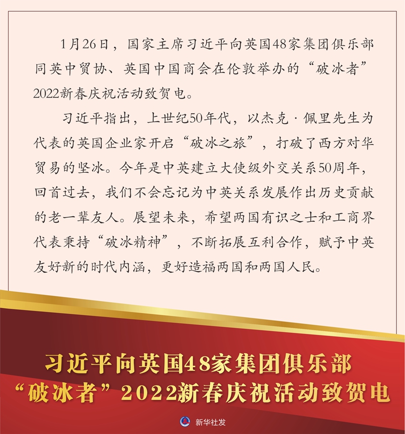習(xí)近平向英國48家集團(tuán)俱樂部“破冰者”2022新春慶;顒(dòng)致賀電