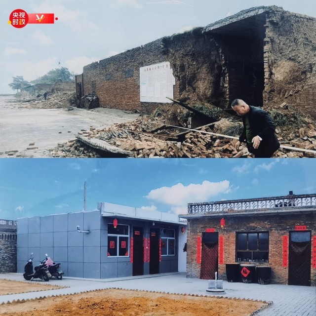 上圖為師紅兵一家受災(zāi)后倒塌的窯洞,下圖為災(zāi)后重建的裝配式住房,共兩間平房,面積50平方米