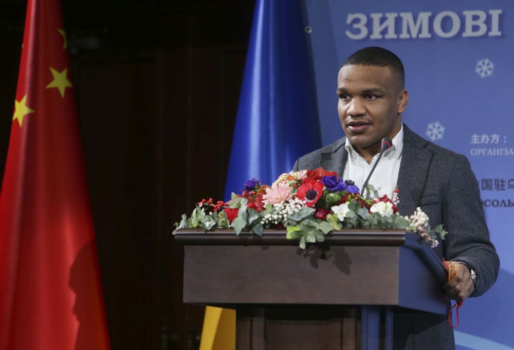 1月26日,烏克蘭摔跤奧運(yùn)冠軍別列紐克致辭。新華社發(fā)(謝爾蓋·斯塔拉斯堅(jiān)科攝)