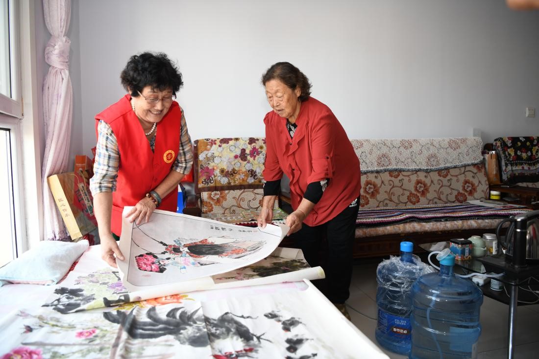 濱河社區(qū)志愿者和老人一起欣賞繪畫(huà)作品。陳琦嘉 攝