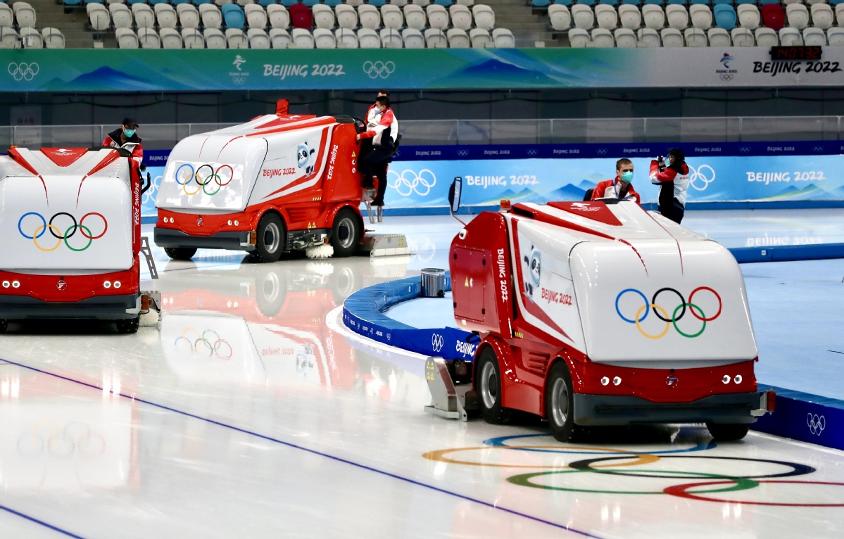 1月30日,在國(guó)家速滑館“冰絲帶”,工作人員使用澆冰車及時(shí)對(duì)冰面進(jìn)行維護(hù),保障冰面質(zhì)量。 中國(guó)日?qǐng)?bào)記者 張威 攝