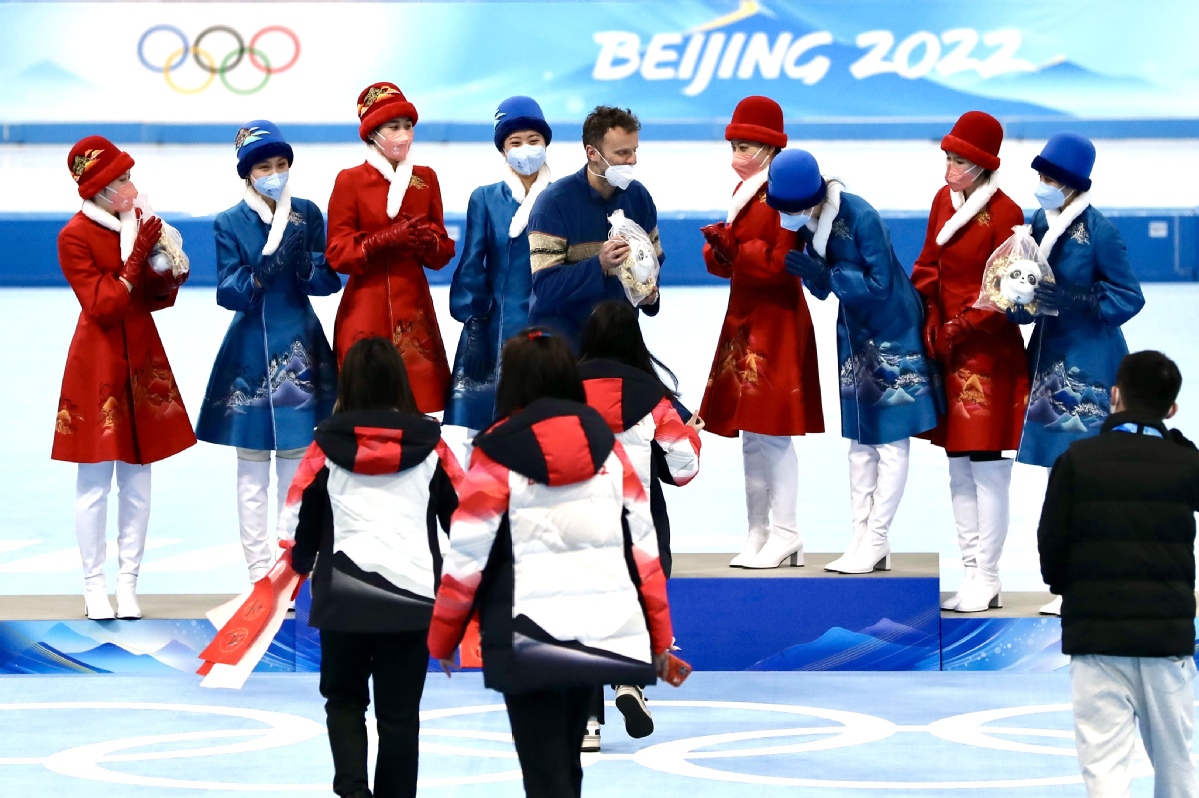 1月30日,拍攝在國(guó)家速滑館“冰絲帶”進(jìn)行頒獎(jiǎng)儀式演練。 中國(guó)日?qǐng)?bào)記者 張威 攝
