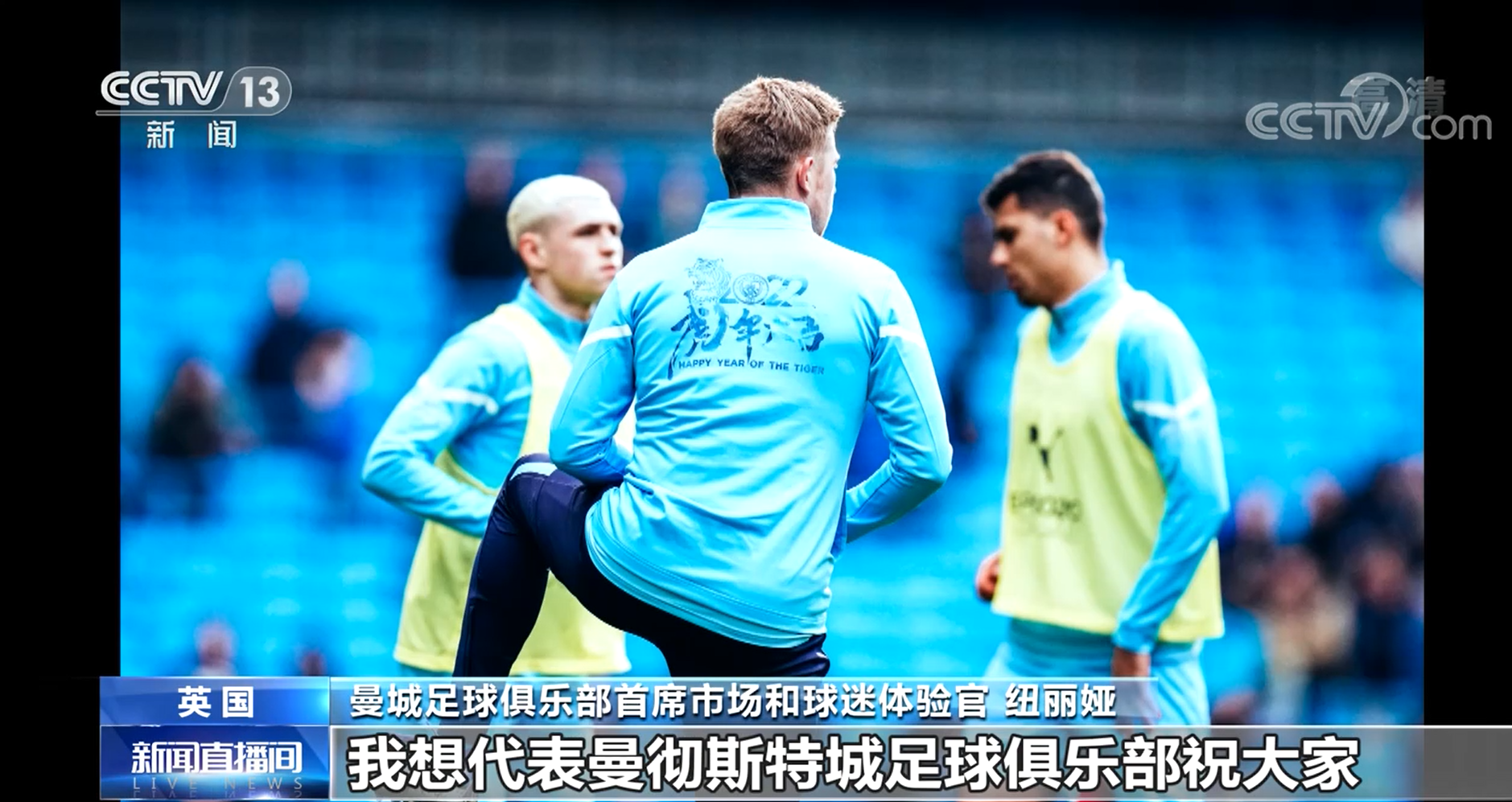 隨著中國虎年春節(jié)和北京冬奧會的臨近,英國曼徹斯特城足球俱樂部也為中國送上了祝福。在此前的比賽訓(xùn)練期間,曼城球隊球員統(tǒng)一身著“虎年大吉”的訓(xùn)練服。在比賽中,曼城主場的場邊廣告牌也打出了“城意滿滿,虎年大吉”的標語。