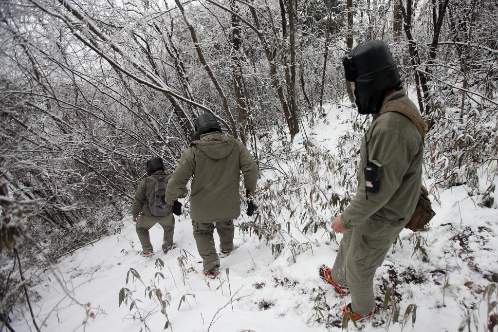 冰雪覆蓋的山林格外安靜,三人從鄉(xiāng)村公路走到林間小路,雪越來越厚,林越來越密。韓永璞拿著鐮刀,砍著攔路樹枝,在密林里鉆了10多分鐘,終于到達(dá)山頂?shù)牡?6號鐵塔。