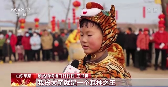 腰站鎮(zhèn)鍋培口村村民 王書(shū)帆:我今年八歲,今天表演“牛斗虎”。小老虎是一種很可愛(ài)的動(dòng)物,我長(zhǎng)大了就是一個(gè)森林之王。