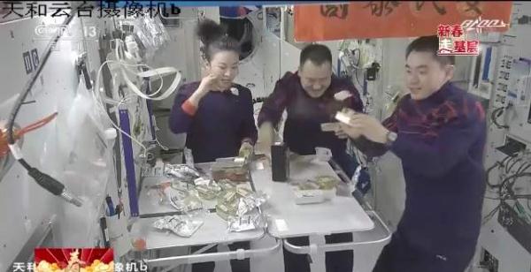 夜幕降臨,華燈初上,航天員開始準備年夜飯,開心過大年。航天員們相互分享美食,餃子飄動,湯汁撲鼻,太空失重環(huán)境下的年夜飯吃得奇妙而歡樂。