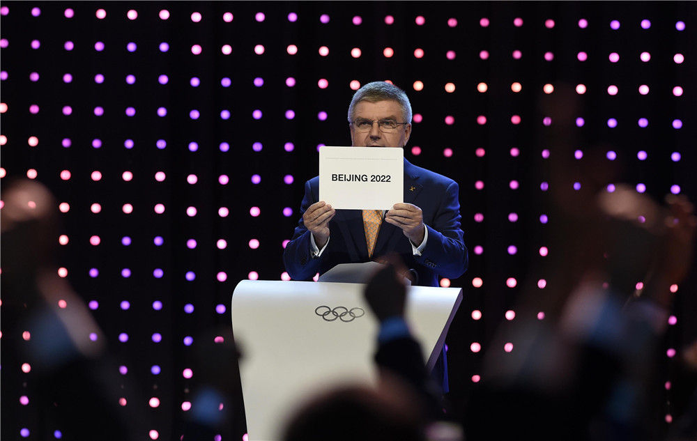 2015年7月31日,國際奧委會主席巴赫在國際奧委會第128次全會上宣布北京攜手張家口獲得2022年冬奧會舉辦權(quán)。新華社記者 公磊 攝