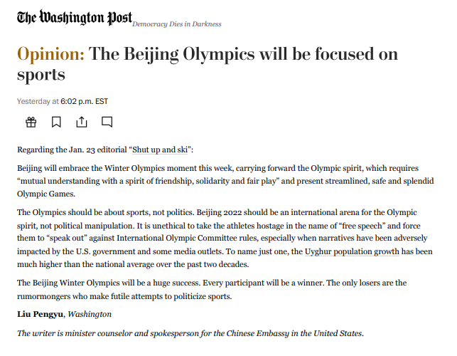 這封信是對《華盛頓郵報》1月22日社論“中國向冬奧會運動員傳遞的信息:噤聲然后滑雪”的回應(yīng)。