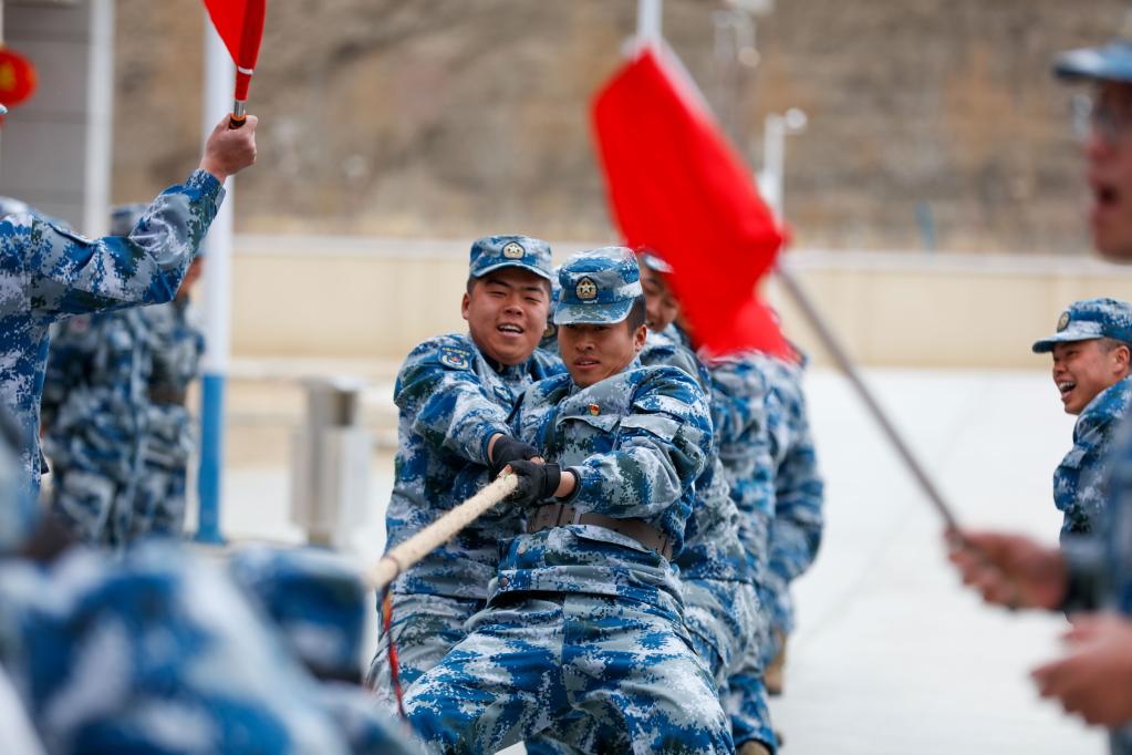 此時(shí)的操場(chǎng)上,“加油”聲此起彼伏。各連之間拔河、滾輪胎、攀繩、籃球等比賽正在進(jìn)行。“節(jié)日期間,組織大家練練體能,運(yùn)動(dòng)一下!标惱仔χf,“今天冬奧會(huì)開幕,雖然我們這兒沒有下雪,但大家對(duì)體育的熱情一點(diǎn)兒不減,也是在雪域高原聲援我們的冬奧健兒!