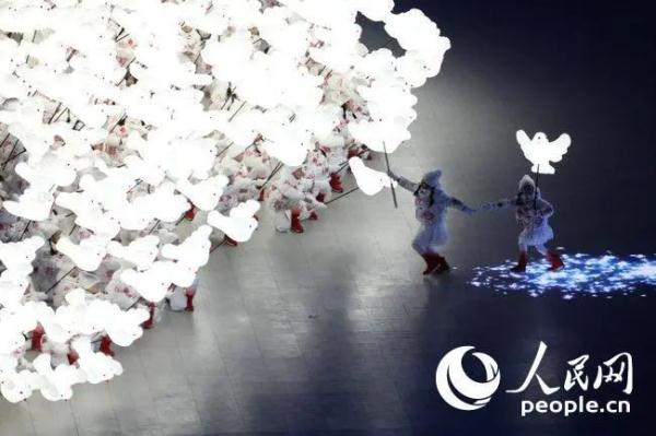 在“放飛和平鴿”環(huán)節(jié),數(shù)百名天真爛漫的孩子們,手持閃閃發(fā)光的“和平鴿”,伴隨著星光般的雪花歡愉奔跑、且歌且舞,最后從舞臺(tái)各方匯聚到正中心,以“心”的形狀環(huán)繞在“大雪花”周圍歡呼雀躍。