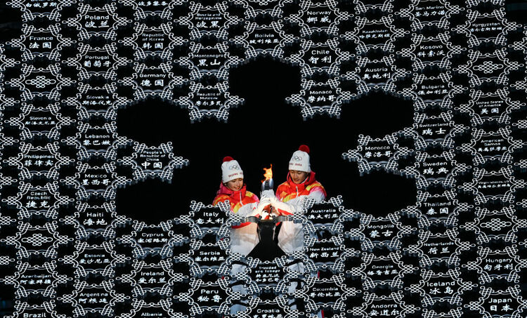 2月4日晚,第二十四屆冬季奧林匹克運動會開幕式在北京國家體育場舉行。這是最后一棒火炬手迪妮格爾·衣拉木江(左)和趙嘉文將火炬嵌入“大雪花”中央。