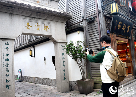 一位游客在拍攝郎官巷。人民網(wǎng) 林曉麗攝