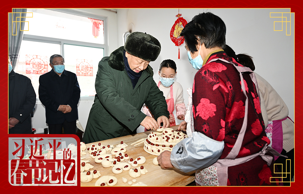2022年1月26日,習(xí)近平總書記在臨汾市霍州市師莊鄉(xiāng)馮南垣村,同師紅兵一家做年饃。