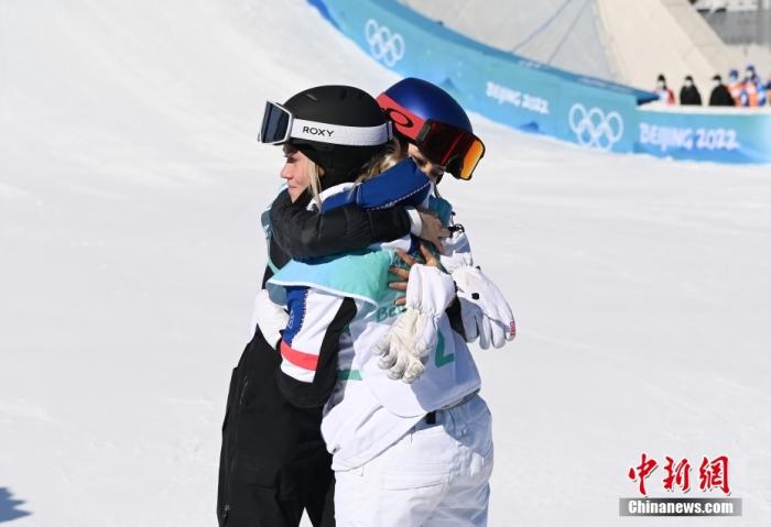 谷愛凌與獲得亞軍的法國選手泰絲·勒德?lián)肀А?中新社記者 毛建軍 攝