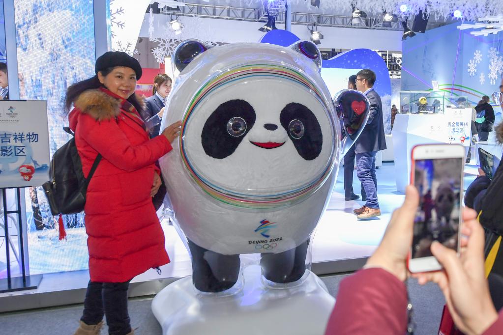 2019年12月13日,參觀者在第四屆吉林雪博會展會現(xiàn)場與北京2022年冬奧會吉祥物“冰墩墩”合影。新華社記者張楠攝