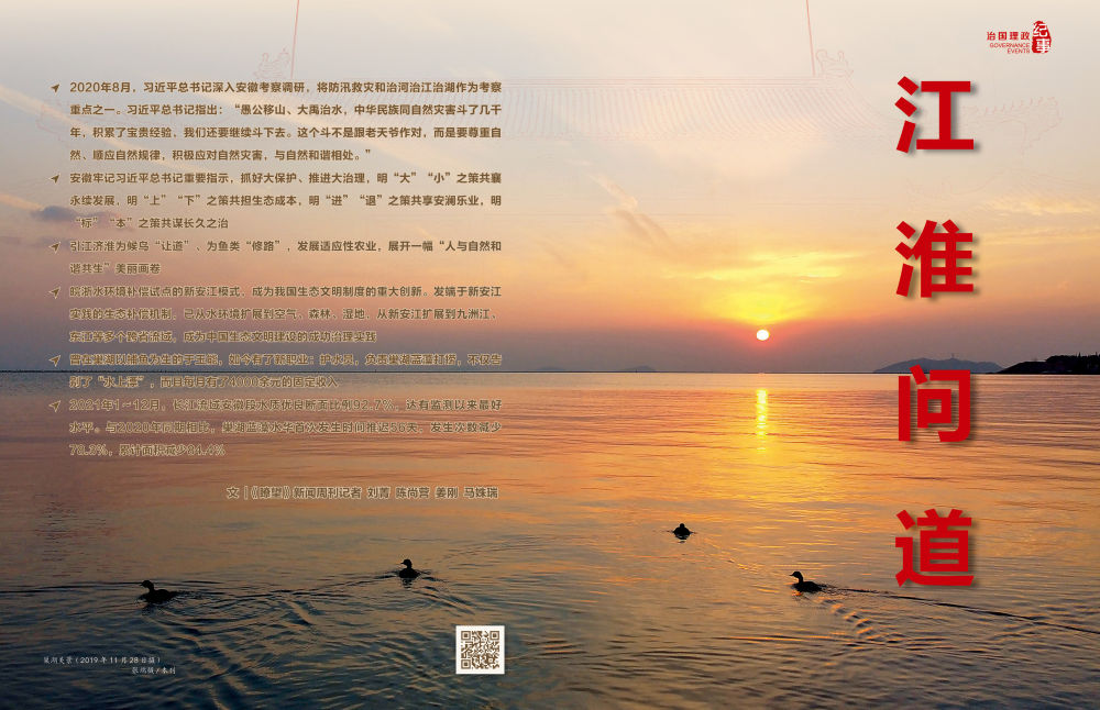 如今,長江之上,從濫捕濫撈到“十年禁漁”;淮河之畔,從人水爭地到人退水進(jìn);巢湖之側(cè),藍(lán)藻治理如火如荼……江淮問道千百年,今日的回答是:實(shí)現(xiàn)“人民保護(hù)長江、長江造福人民”的良性循環(huán),早日重現(xiàn)“一江碧水向東流”的勝景。