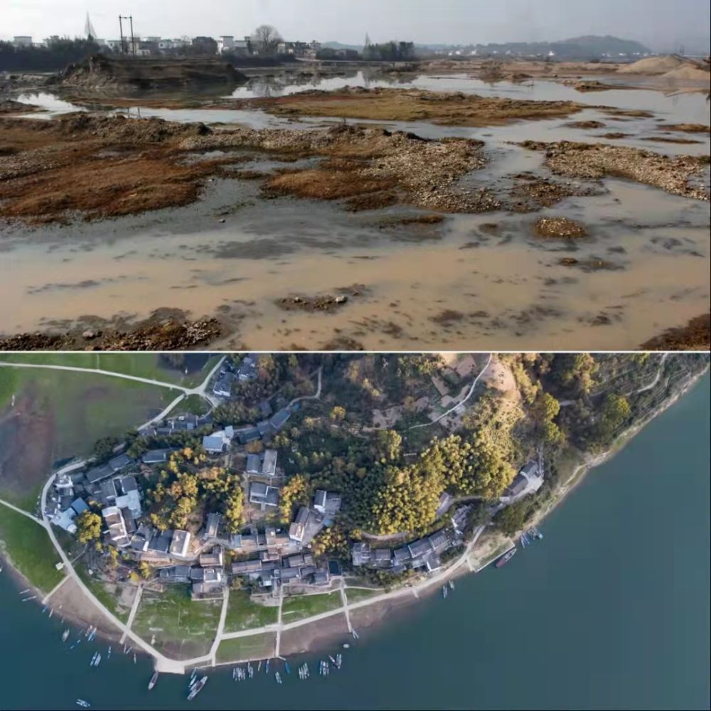 ▲上圖:新安江源頭之一的橫江上,采砂后洗砂污水直接排入河流,造成水質(zhì)變差(2008年1月5日攝)。下圖:新安江山水畫廊(2019年11月15日,新華社記者 韓曉雨/攝)