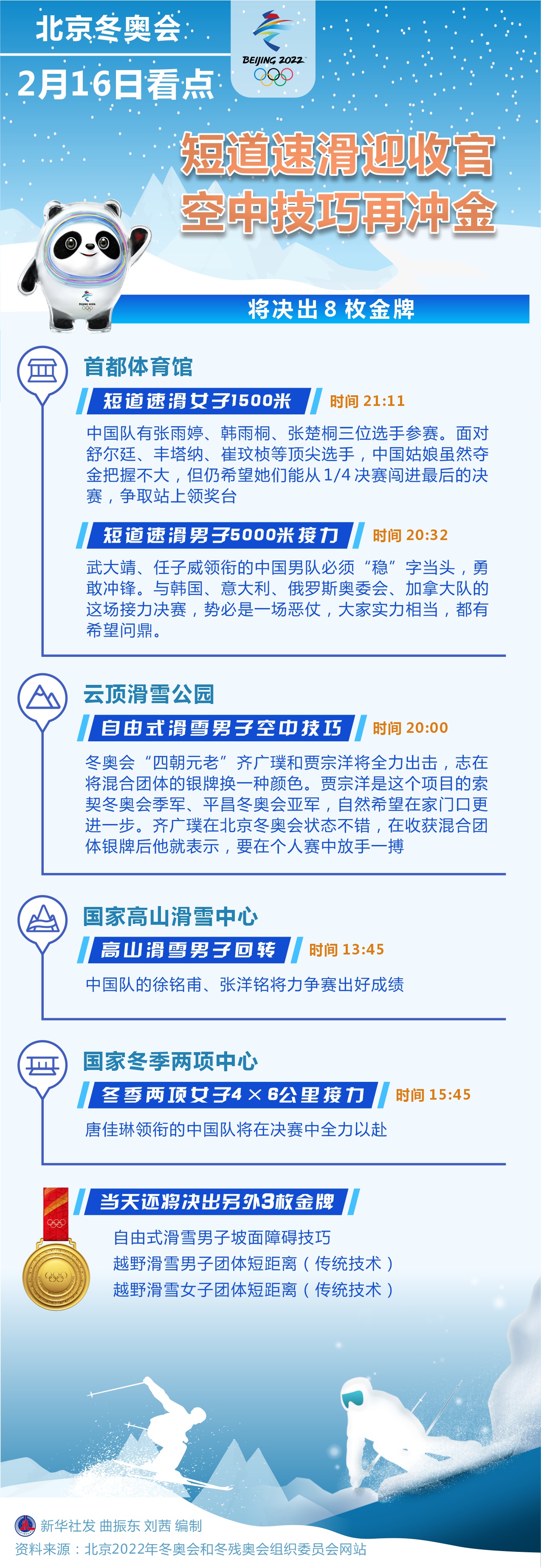 新華社北京2月15日電(記者張澤偉、王恒志)北京冬奧會16日將決出8枚金牌,其中短道速滑進入最后一個比賽日,將產生男子5000米接力和女子1500米兩枚金牌,期待中國健兒出色發(fā)揮、完美收官。另外,齊廣璞、賈宗洋兩位“四朝元老”將在自由式滑雪男子空中技巧項目全力沖金。